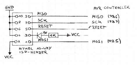 The AVR controller has to be programmed. We have to write the firmware to the controllers flash-memory. This can be done with an AVR programmer. The STK500 starterkit from Atmel has such a programmer on board, but you can also build your own device or buy a programmer. You can download AVR Studio from the Atmel website. With AVR Studio you can compile your code and program all AVR devices, including our ATMega8535. To be able to reprogram the controller once it is soldered into our PCB, there is a 10 pin ISP Header on the interface (for In System Programming). This ISP Header has to be connected to the STK500 or to any other AVR-programmer. When the interface was connected to the programmer, it can be programmed with AVR Studio 4. Here is a picture of the ISP Header on the 1541 interface:
